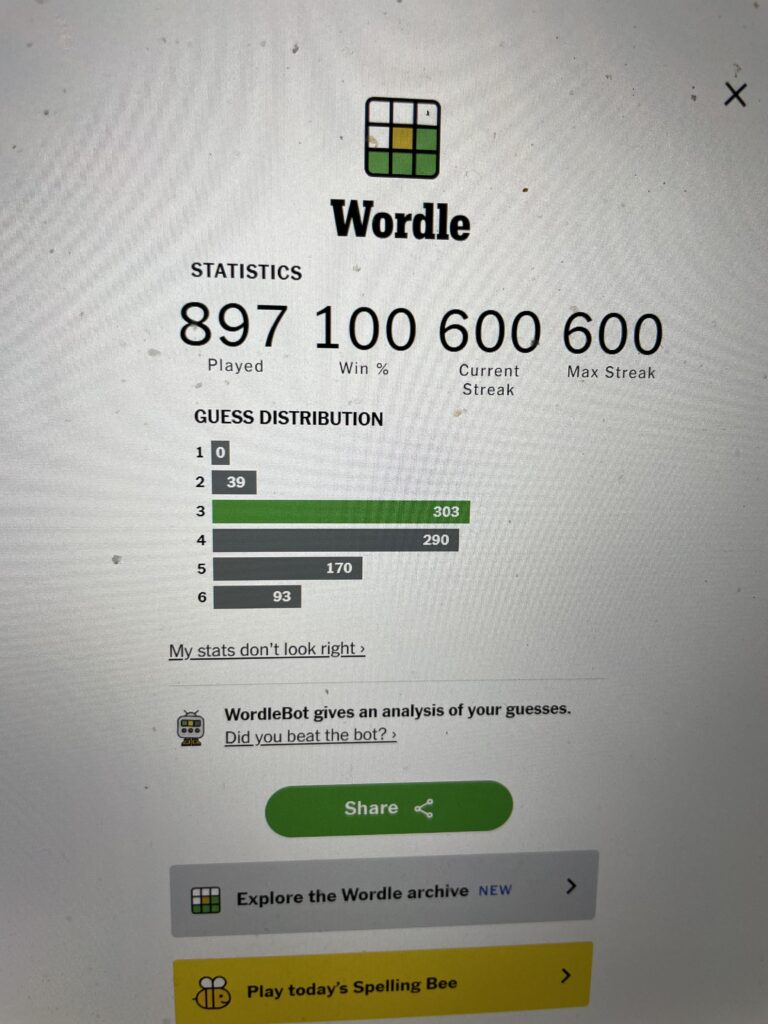 That morning, I got my 600th Wordle in a row. It helped that I read WordleBot’s suggestions and compared notes afterward with my wife and my Wordle buddy Matthew. Then I played my 400th game of Quordle and moved from 98% to 99% correct. I have my longest win streak, 128 games.