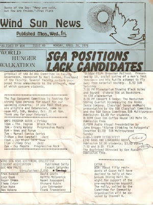 When I was in college, I was co-editor of a thrice-weekly newsletter, inexplicably called the Wind Sun News, sponsored by the Student Government. They instituted this publication in no small measure because the editors of The Oracle, the student newspaper, decided that political issues such as American involvement in overthrowing Chile’s Allende in favor of Pinochet were more important to cover than the prosaic issue of college governance.