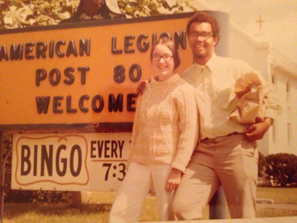 This is me with Cecily, a few blocks from the high school. What the heck was I carrying? The setting, undoubtedly, was meant to be ironic. This is a picture I once DID own, but was lost for decades.
