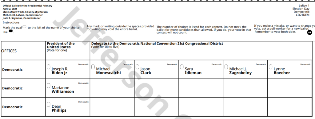 I am a registered Democrat. My ballot had three choices: incumbent Joe Biden, Marianne Williamson, and Rep. Dean Phillips (MN). I voted for Phillips, whose “adoptive paternal grandmother Pauline Phillips was the author of the advice column ‘Dear Abby,’ under the pen name Abigail Van Buren.” After Super Tuesday, he dropped out of the race on March 6, though his site was still up as of April 3. Biden became the presumptive nominee by March 13.