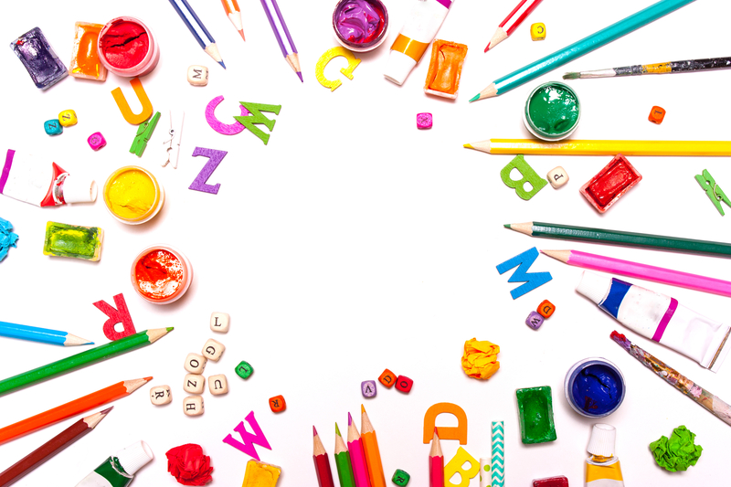 A background of colored pencils, paints. Workplace designer, artist, concept art
