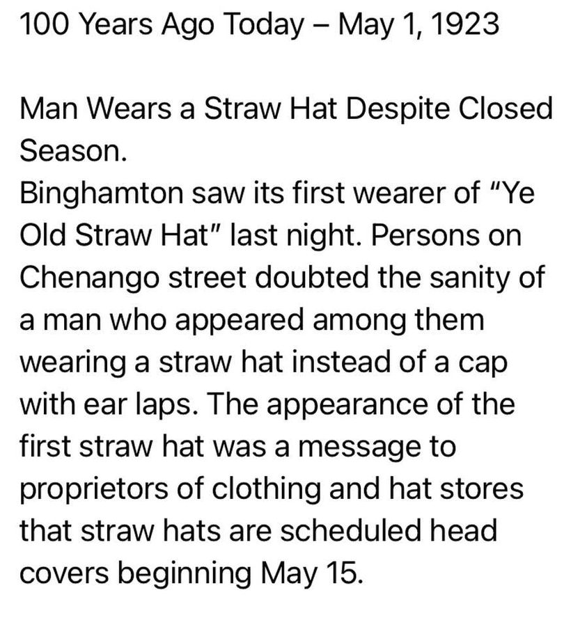 In the Binghamton (NY) Press on May 1, 1923, page 5, was a story titled Wears A Straw Hat Despite Closed Season. The subtitle: Bold young man braves chilly weather by parading in summer regalia, anticipating official date by 14 days.