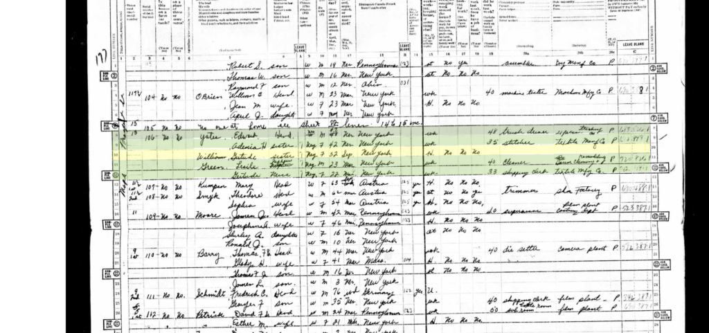 But where’s Clarence? Fuzzy gossip suggested that Lillian and maybe even Harriet (d. 1928) drove him away. I never got the real story. Gert is 32 and working as a servant.