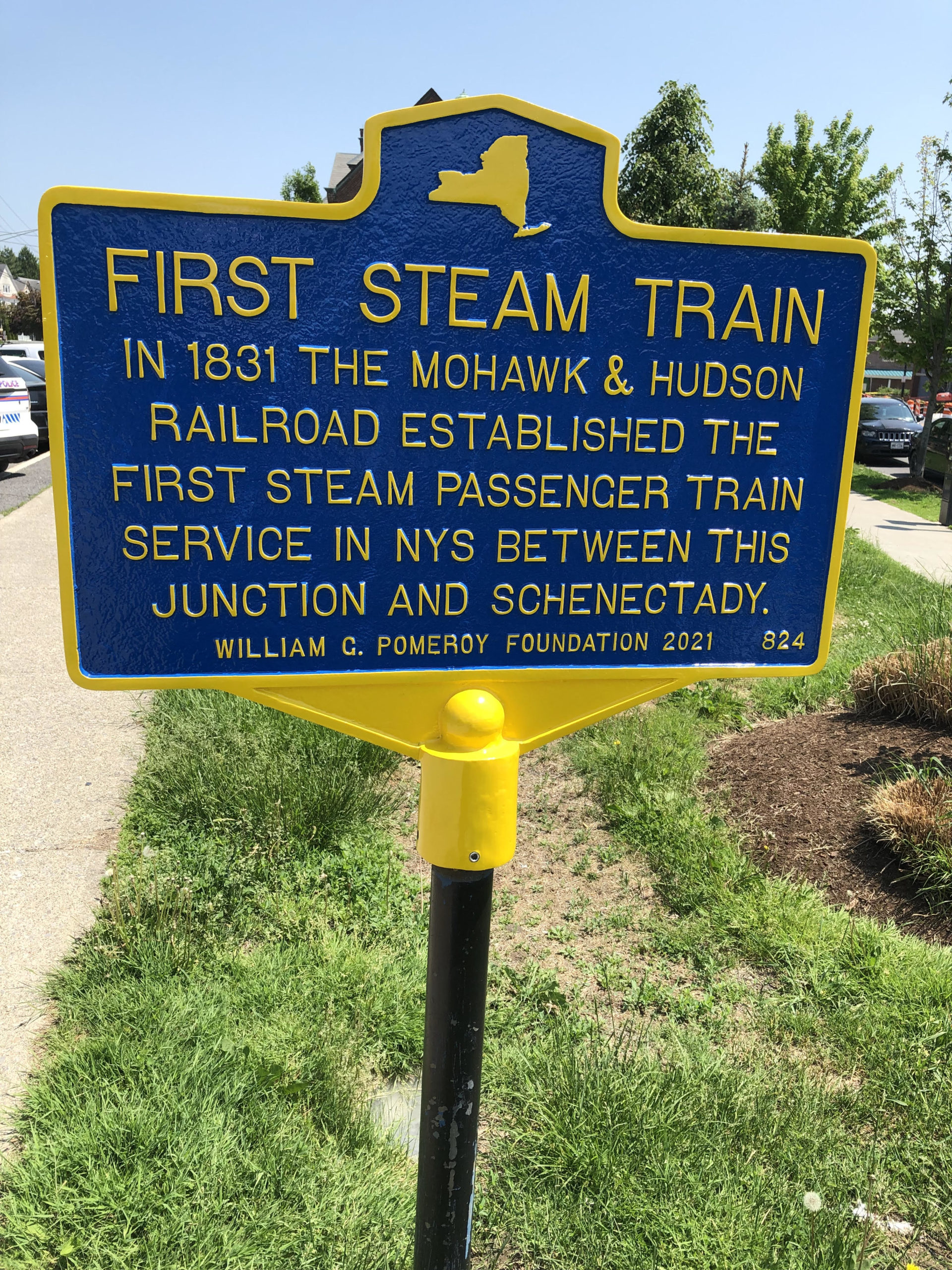 “In August of 1831 the first steam-powered passenger train in New York State, powered by the locomotive DeWitt Clinton, traveled between this place (junction of Railroad and Great Western Turnpike, now Western Avenue in Albany) on the Mohawk and Hudson Railroad line and Schenectady.”
